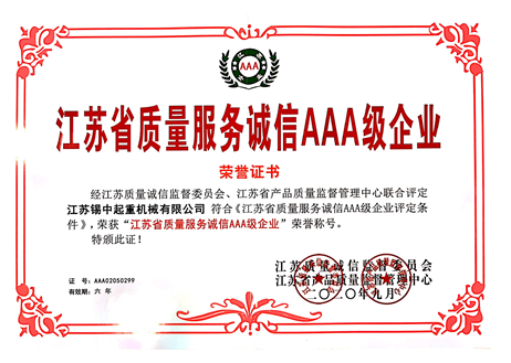 公司獲得《江蘇省質(zhì)量服務誠信AAA級企業(yè)》